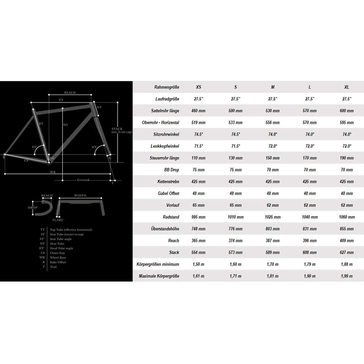 max. Reifenbreite: 650B x 52 / 700C x 45C (vorn), 650B x 52C / 700C x 40C (hinten)