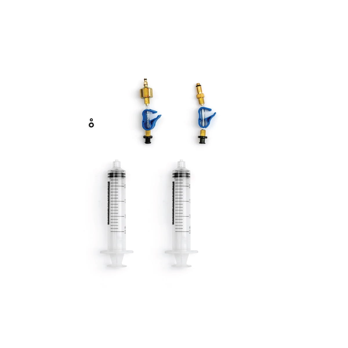 Das Basic Edge-Kit von Bleedkit für SRAM-Hydraulikbremsen umfasst Spritzen, M5- und Edge-Baugruppen für die Hebel- und Bremssattelenden sowie Ersatz-O-Ringe.