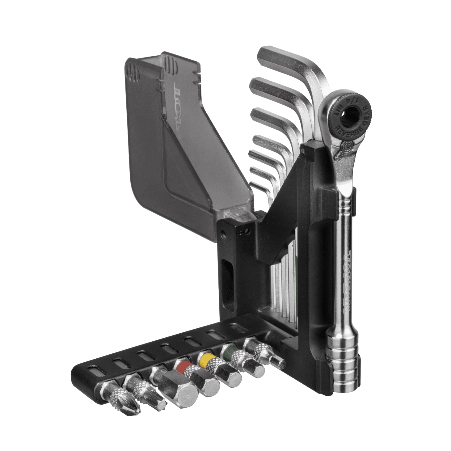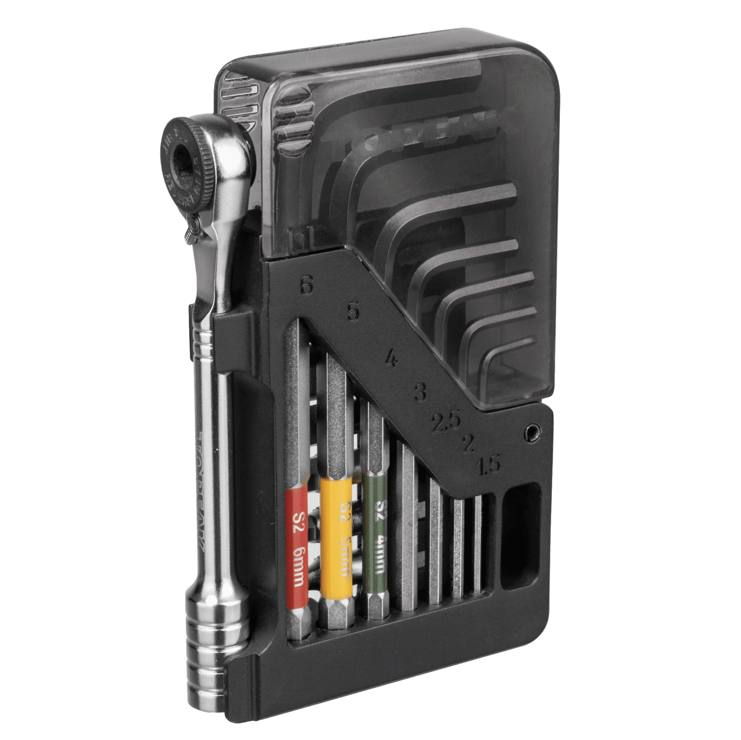 Die Onmi ToolCard mit 16 Funktionen beinhaltet sieben Innensechskantschlüssel in den Größen 1,5 – 2 – 2,5 – 3 – 4 – 5 – 6 – 8 mm mit Rundkopf, T10 – T15 – T20 – T25 Torx-Bits und Phillips 2 Schraubendreher, zusätzlich dazu eine Ratsche samt den dazugehörigen 7 Ratschen-Bits in den Größen 3 – 4 – 5 – 6 – 8 mm sowie einem Phillips 2 Schraubendreher-Bit. Alle Werkzeuge bestehen aus robustem und gehärtetem Werkzeugstahl. All diese Features sind in einer innovativen und kompakten Faltbox untergebracht, sodass diese bequem in jede Tasche passt.