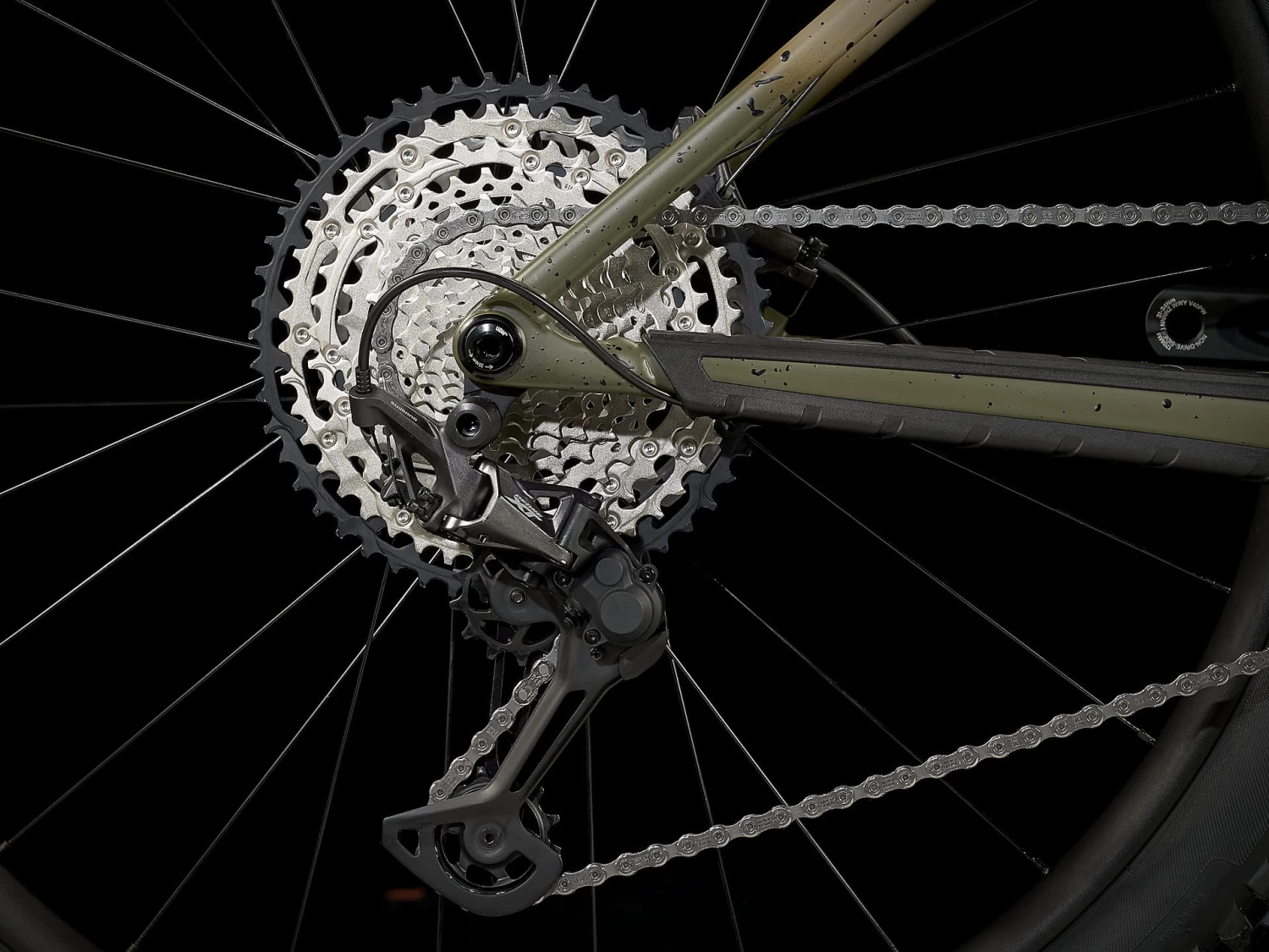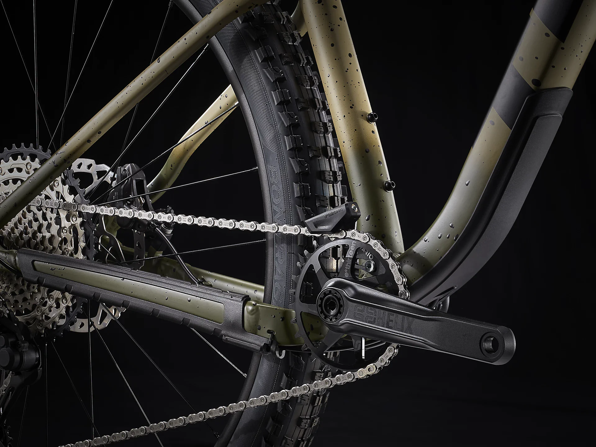Einen leichten Aluminiumrahmen, eine 140 mm FOX Rhythm-Gabel mit 36 mm starken Standrohren, einen Shimano SLX/XT 1×12-Antrieb mit breitem, kletterfreudigem Übersetzungsverhältnis, kraftvoll zupackende 4-Kolben-Scheibenbremsen und eine Variosattelstütze für mehr Platz auf Abfahrten, in Kurven und in der Luft. Dazu kommen schnell rollende 29″-Laufrädern und griffige, 2,6″ breiten Reifen.